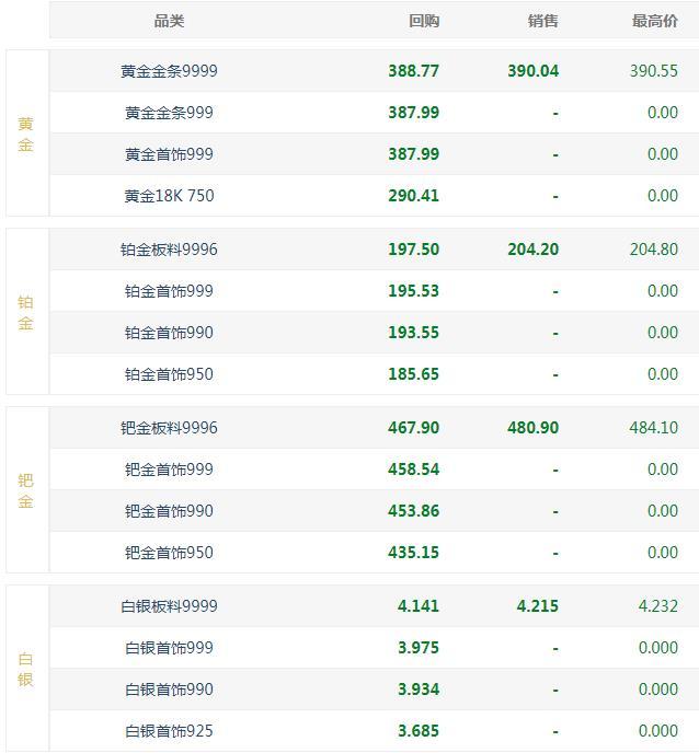 今日黄金回收价格388元一克,黄金销售价格390元一克;铂金回收价格197元一克,铂金销售价格204元一克;钯金回收价格467元一克,钯金销售价格480元一克;白银回收价格4元一克,白银销售价格4元一克。
