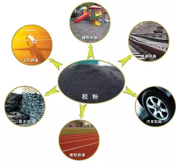 目前来说对废旧轮胎的回收再利用主要集中在橡胶粉和橡胶颗粒方面。因为橡胶独有的高强度,耐磨,防水,减震,耐老化等特性,被广泛应用于橡胶跑道,改性沥青,橡胶地砖,防水材料,橡胶制品等领域。
