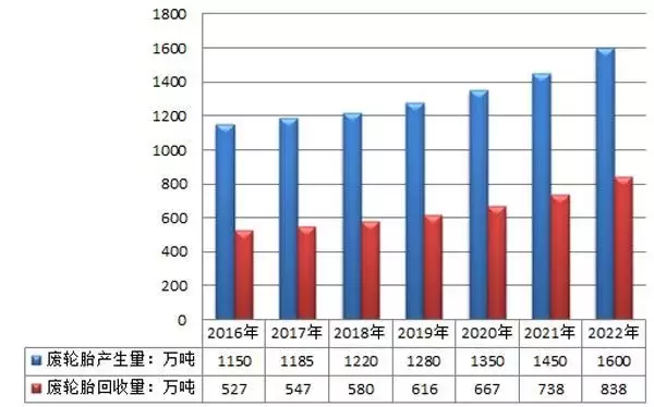 据有关部门统计我国在2012年产生的废旧轮胎为2.83亿条,并且是在以每年5%的速度增长,预计到2020年废旧轮胎产量可达1350万吨,而回收量也只占到50%左右。