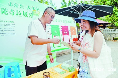 南普陀义工带着自编自制的标语,向市民游客宣传垃圾分类和垃圾不落地理念。